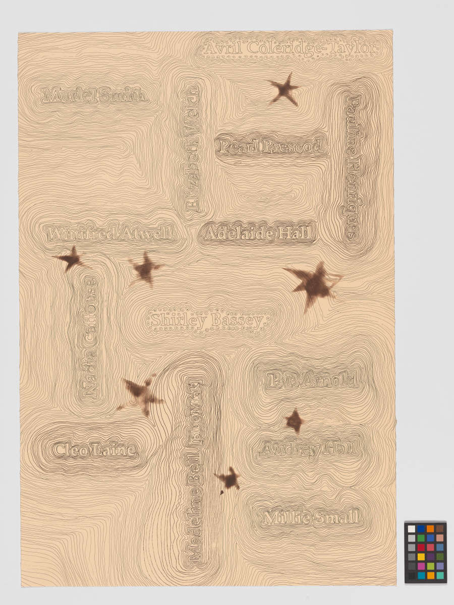 Verso: l.l., Brodsky Center stamp, in graphite: (above stamp) Brodsky/Center, (below stamp) 07-325, (right side of stamp) B.C.I. 9/20; l.c., in graphite: 1930s to 1960s; l.r., in graphite: Sonia Boyce/2007