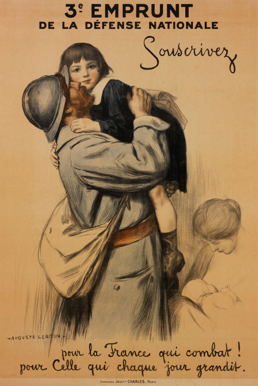 Title printed on top: "3e EMPRUNT / DE LA DÉFENSE NATIONALE / Souscrivez"; printed on bottom: "pour la France qui combat! / pour Celle qui chaque jour grandit."; artist name signed in stone in LL corner: "-AUGUSTE LEROUX-"; printer name printed along bottom edge: "IMPRIMERIE JOSEPH CHARLES_PARIS"