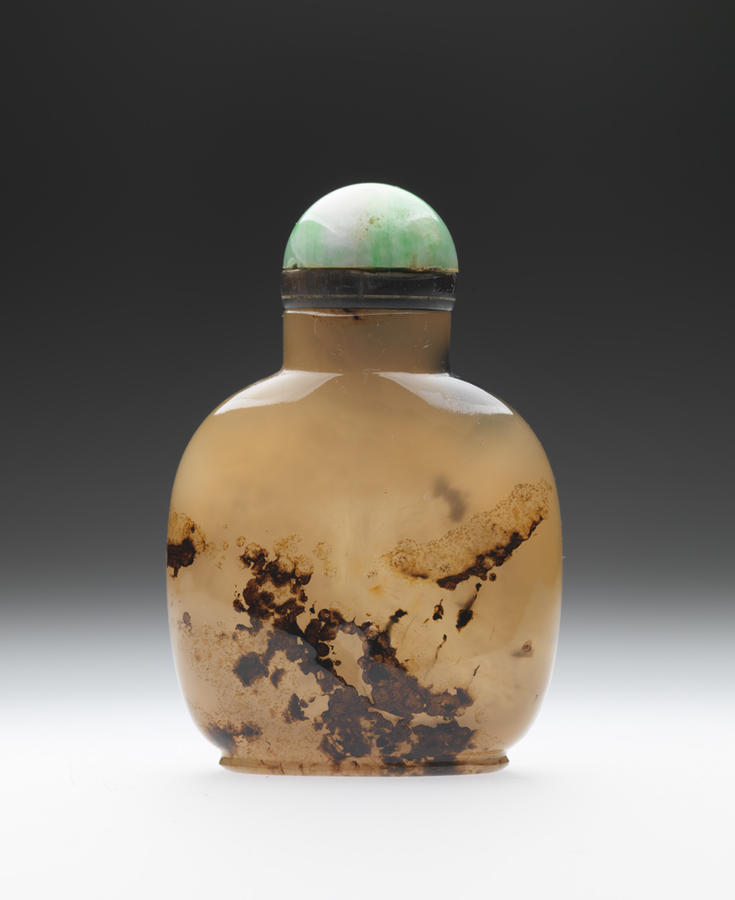 Agate Snuff Bottle with Jade Cap, early 1800s