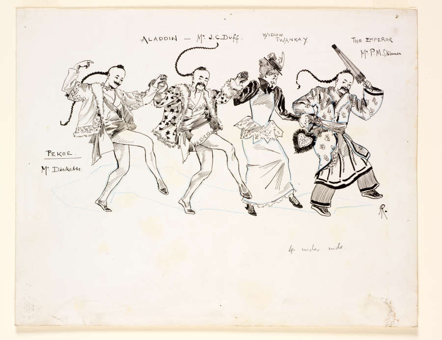 Inscribed in pen and ink: "Pekoe - Mr. Dicketts. / Aladdin - Mr. J. C. Duff / Widow Twankay / The Emperor Mr. P. M. Skinner / AR."; and in graphite, LR: "4 inches wide"