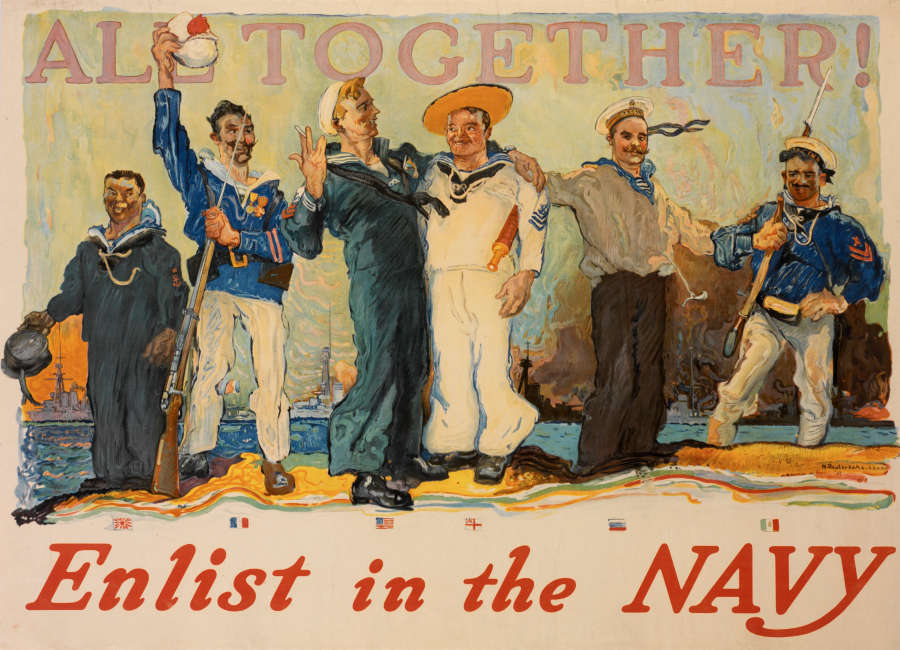 Title printed on top: "ALL TOGETHER!"; printed at bottom: "Enlist in the NAVY"; artist name signed and dated in stone in LL corner: "H. Reuterdahl. U.S.N.R.F / '17"