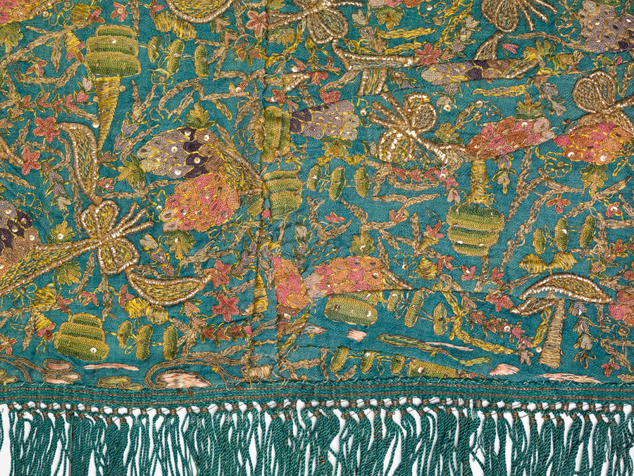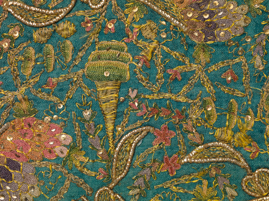 Wool, silk, metallic-wrapped yarn, metal sequin, cotton; twill weave with embroidery and appliqué, pieced