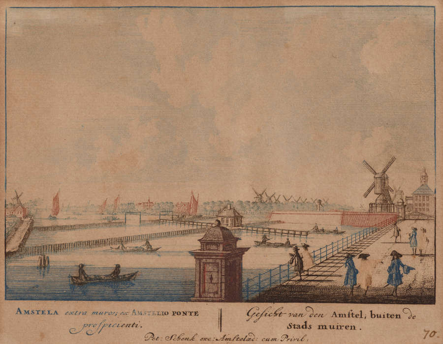 Inscribed in ink on lower left half "AMSTELA extra muros; ex AMSTELIO PONTE" / "profpicienti.", at lower right half "Geficht van den Amftel; buiten de" / "Stads muiren.", at bottom "Pet: Schenk exc: Amftelod: cum Privil:". Inscribed in ink by hand on LR "70.".