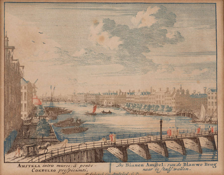 Inscribed in ink at lower left half "AMSTELA intra muros; a ponte" / "COERULEO profpiccienti." at lower right half "De Binnen Amftel; van de Blauwe Brug" / "naar de Stadfwallen." at bottom "P. Schenck Exc Amftelod. C.P.".