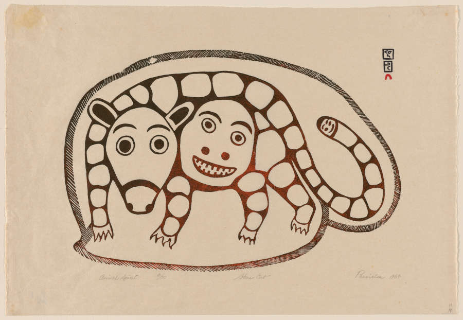 Signed and dated in pencil at LR:Pannichea 1964; other inscriptions at LR, LC, LL. Cape Dorset community stamp at UR.