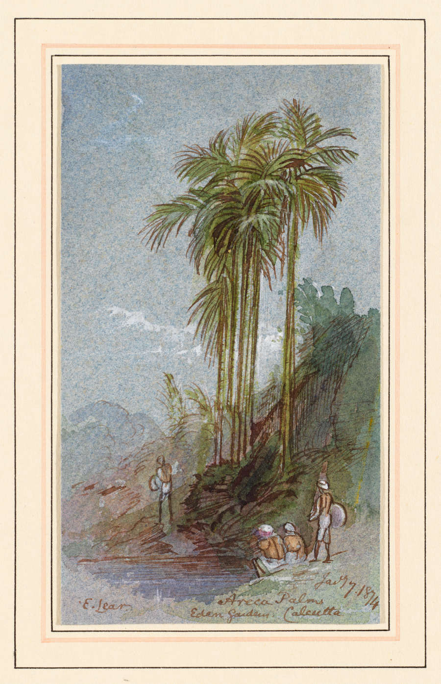 In brown ink, LL:E. Lear. ; LR:(with title) Janny 7.1874/Areca Palms/Eden Garden Calcutta