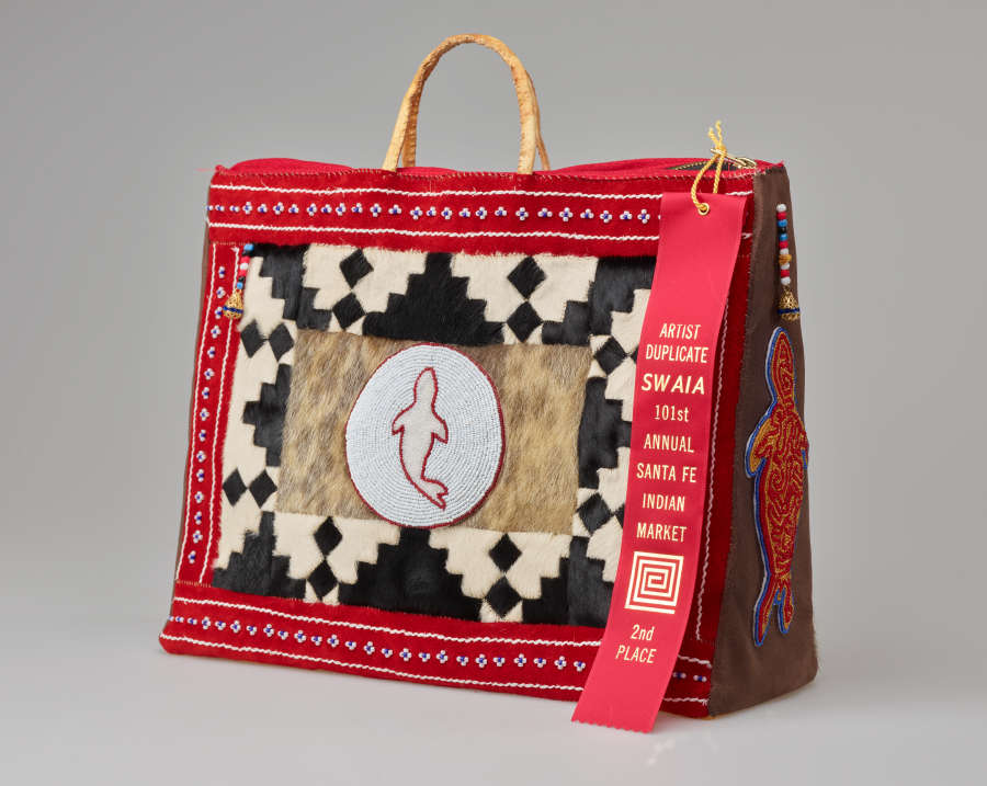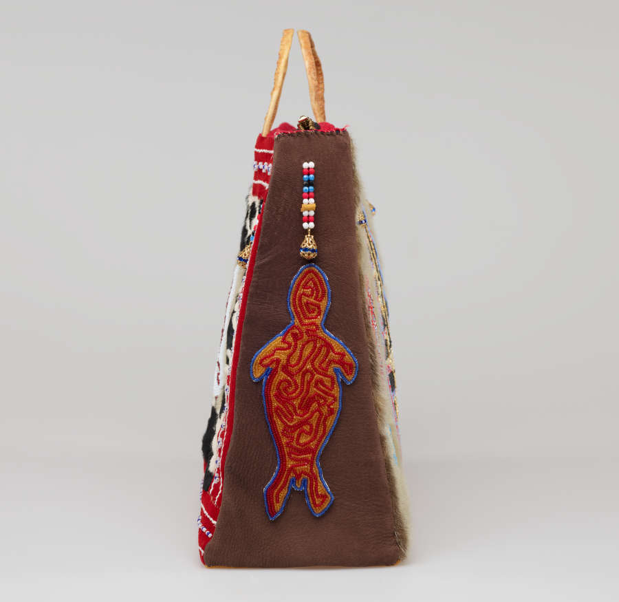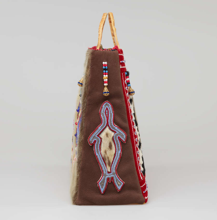 Intarsia and appliqué home tanned seal fur and leather, porcupine quillwork, and applied beadwork. Lined in plain woven, printed cotton.