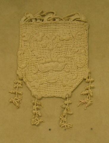 Linen drawn work, applied needle lace, Casalguidi embroidery (also called whitework), knotted and macramé tassels; raised stem stitch, buttonhole bars