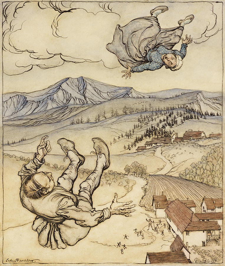 The Bailiff and his wife floating about in the air where thy'd been kicked by the Young Giant,