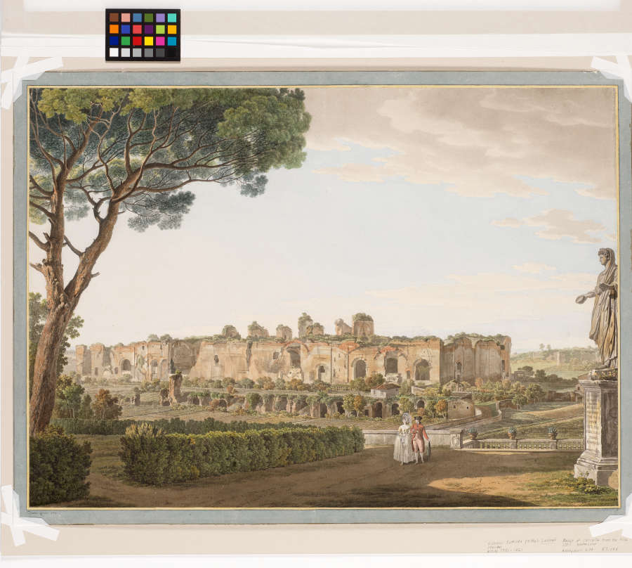 Inscribed in pen and ink on old mount, LL:"Titta Lusier 1781" Inscribed in ink on verso: "Veduta delle Terme di Caracalla presa dalla Villa Mattei sul Monte Celio"