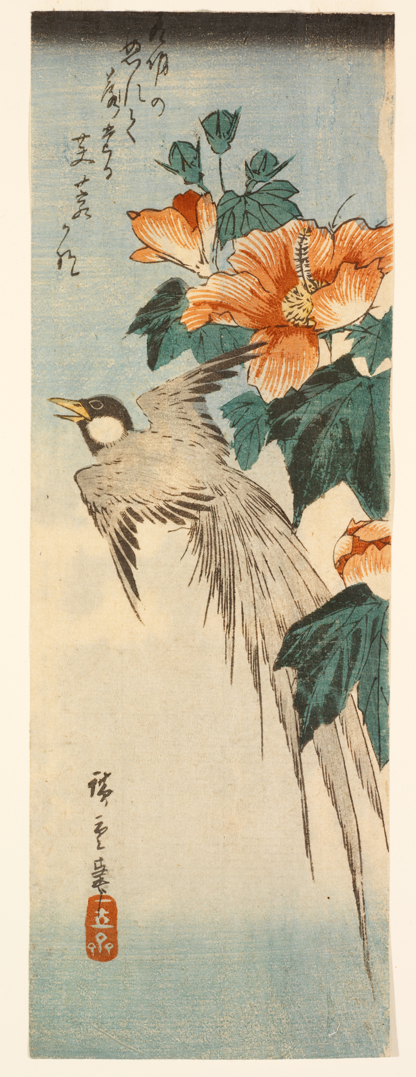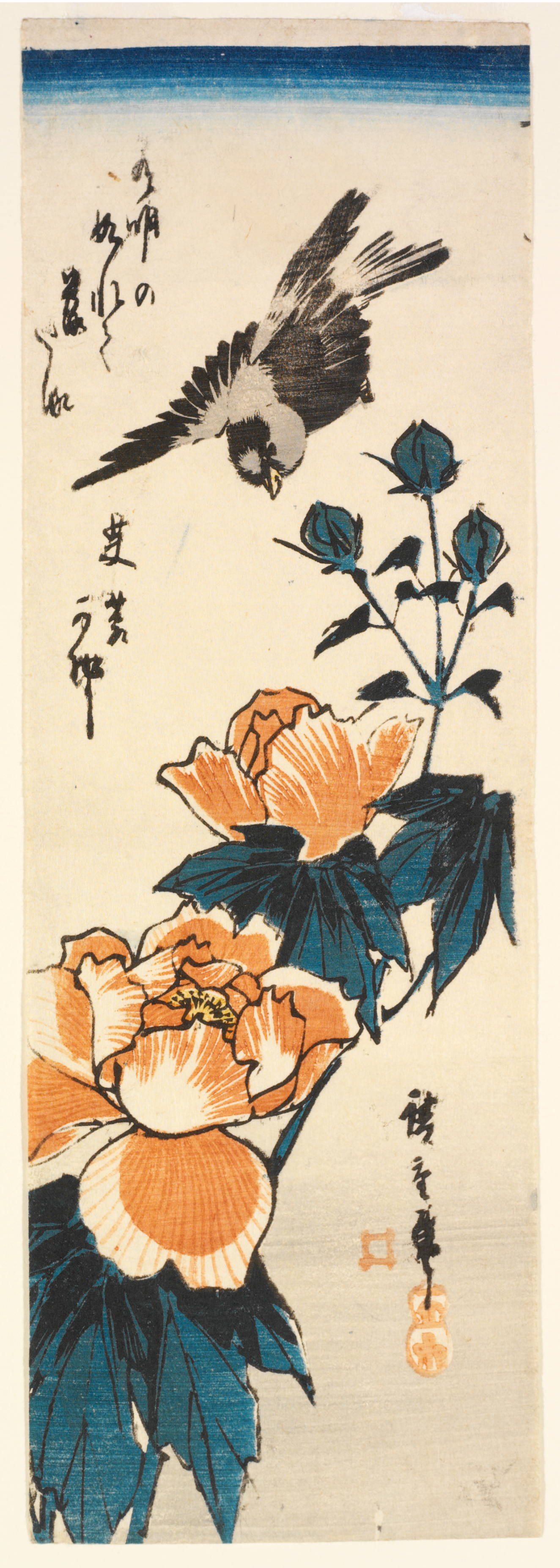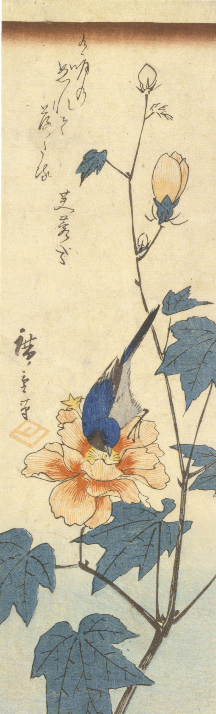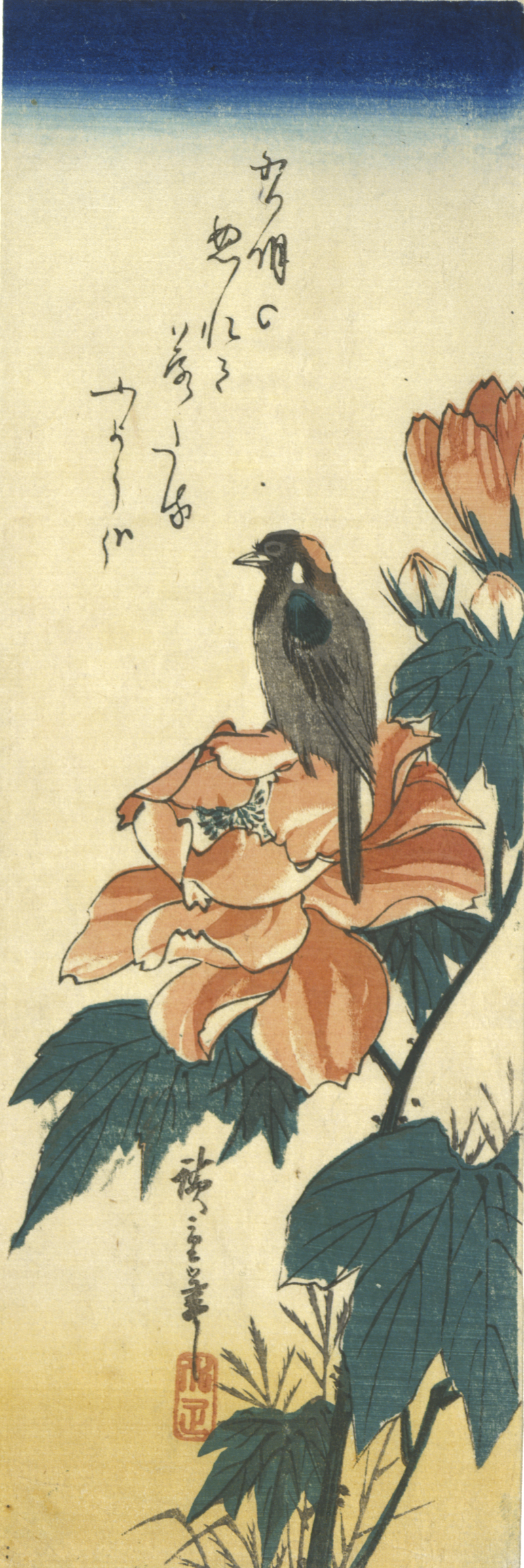 Translation: The moonlight at dawn, see the rose damp with dew and blossoms fallingSignature: 廣重筆 Hiroshige hitsu (Brushed by Hiroshige)