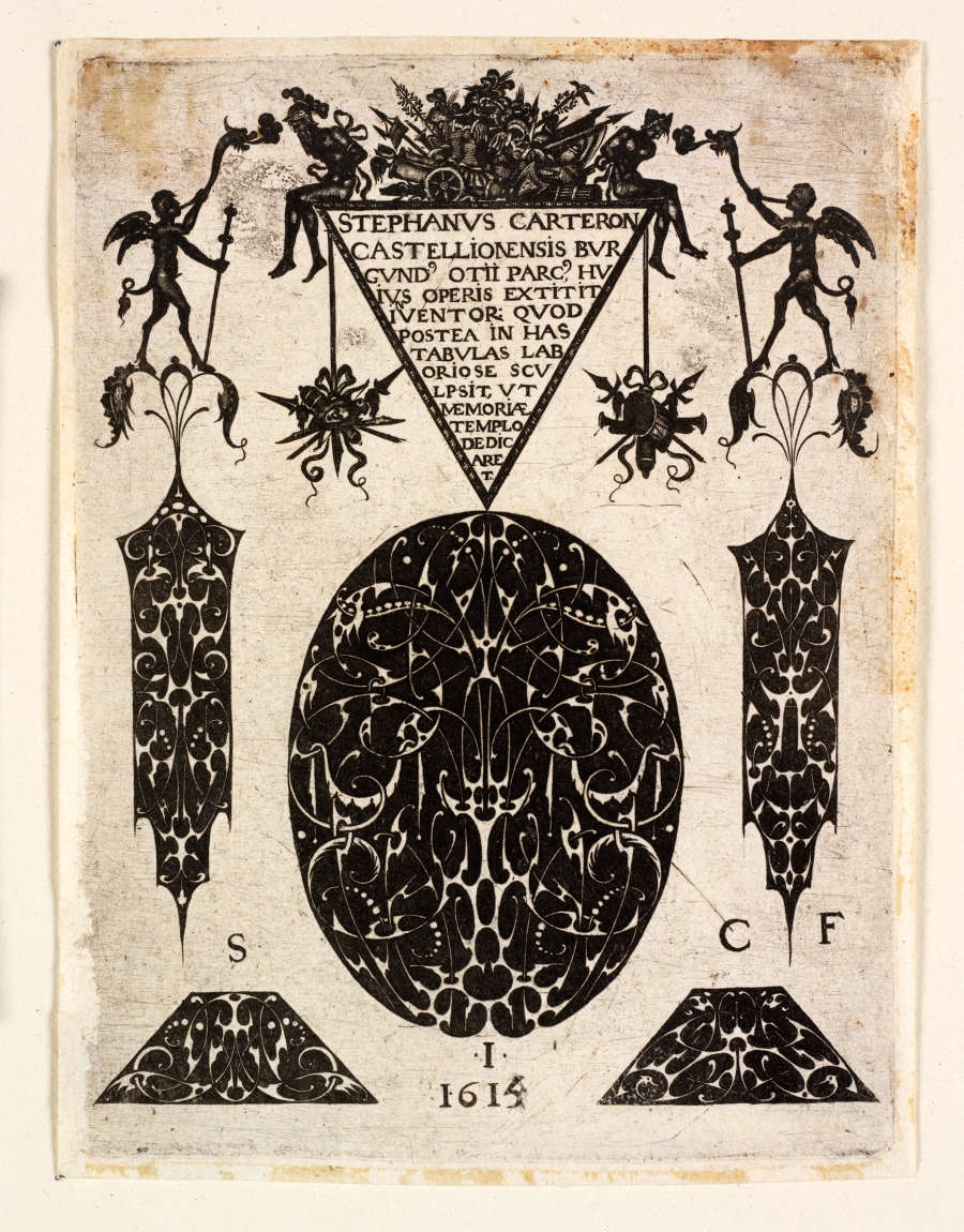 Lettered within image in a triangle UC: "Stephanus Carteron Castellionensis Burgundus otii parcus huius operis extitit inventor quod postea in has tabulas laboriose sculpsit ut memoriae templo dedicaret"