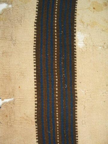 Label: "Chimayo blanket Very Old; No Charge" paper tag on bottom edge in center of blanket.