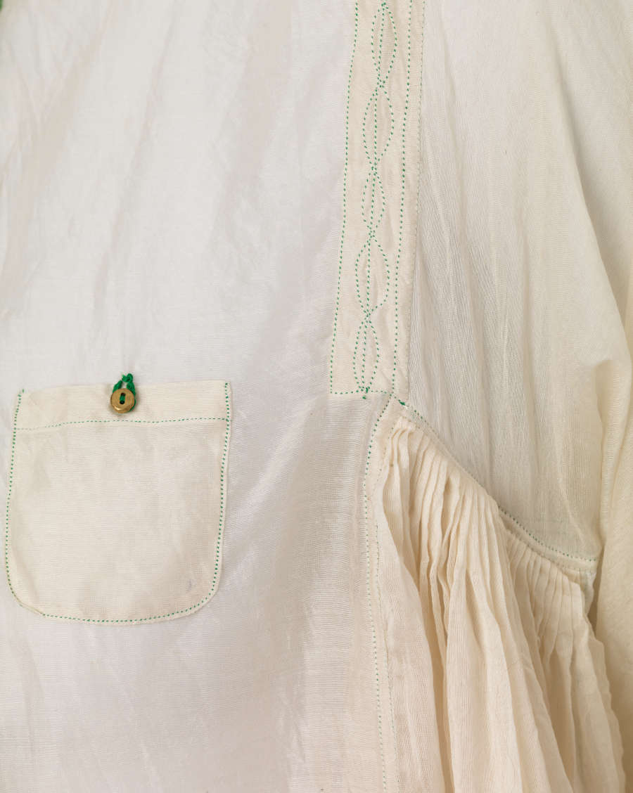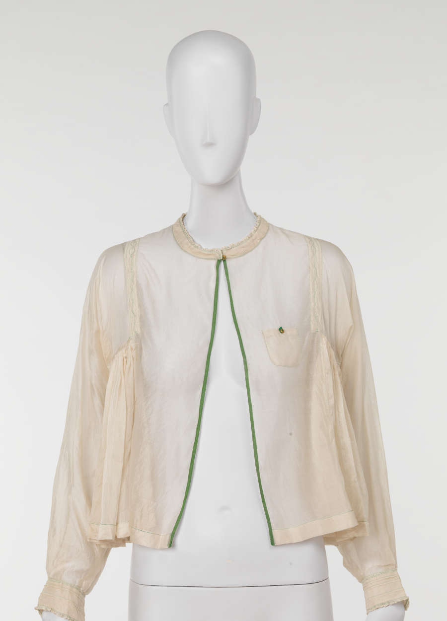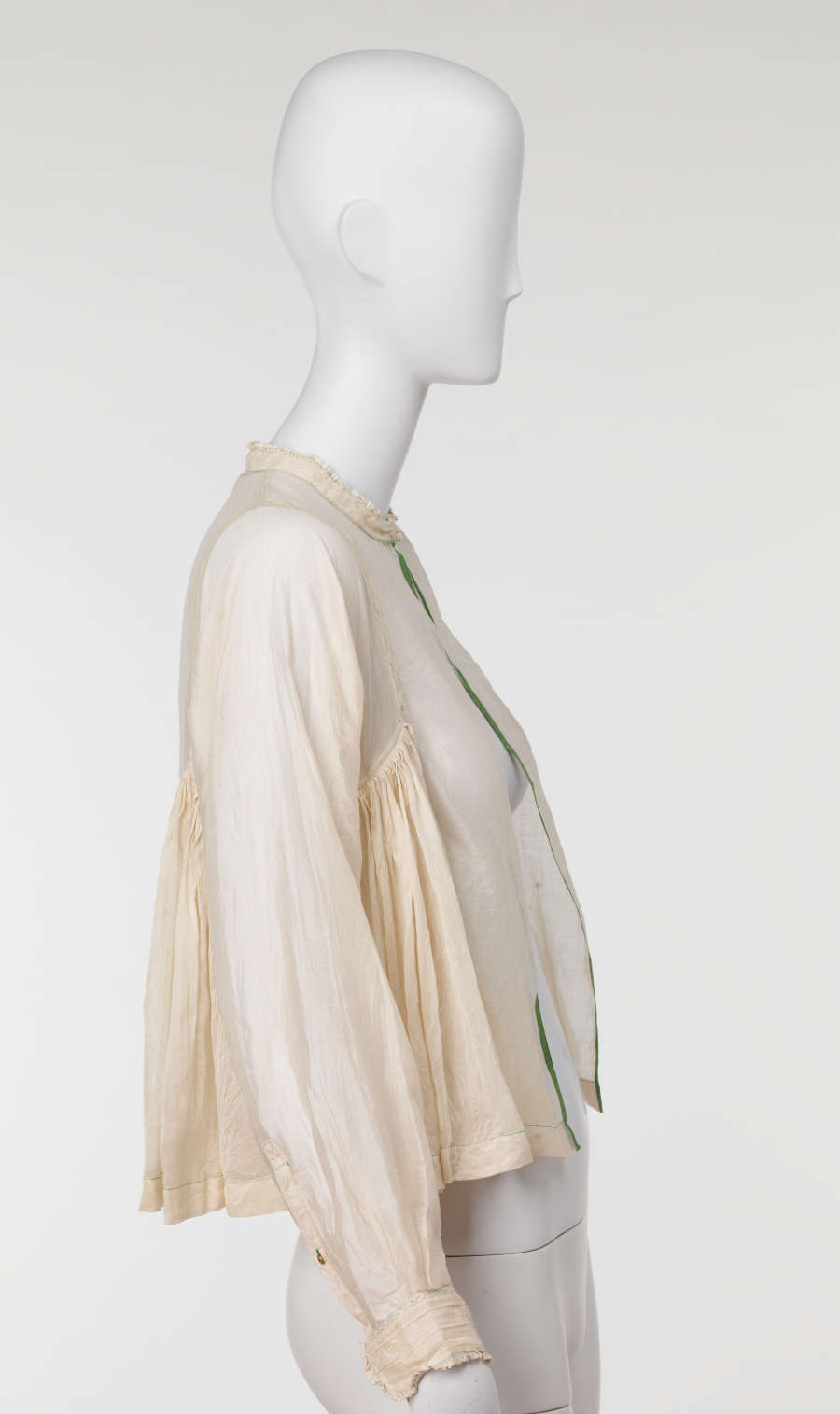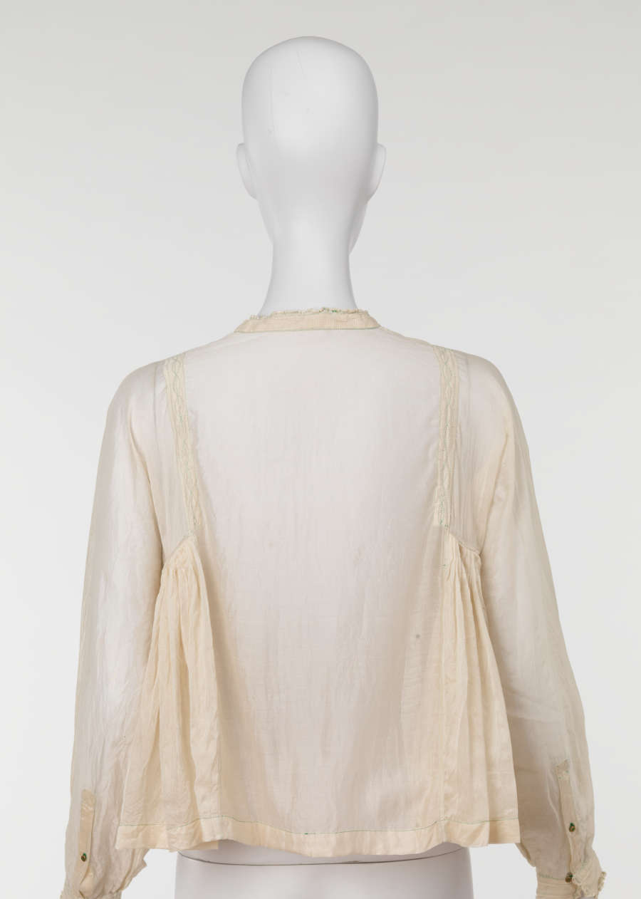 4. Materials/care/instructions tag: Injiri 50% cotton 50% silk, dry clean only, made in India, comes with two extra brass buttons . Small tag “38”. Credit / Object Number