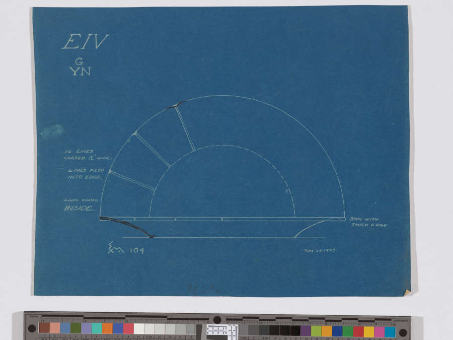 White on blue, blueprint: "EIV / G/YN / 16 LINES / CHASED 1/16" WIDE. / LINES FILED / INTO EDGE / LINES CHASED / INSIDE." in upper left corner down left margin. "EM. 104" in lower left corner. "SPIN WITH / THICK EDGES" to right of plate. "MAY 24 1927" in lower right corner. "98096" in pencil at bottom center of page. Some pencil scribbles on backside.