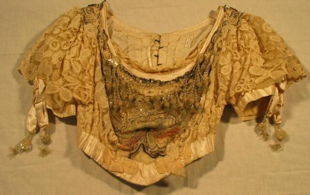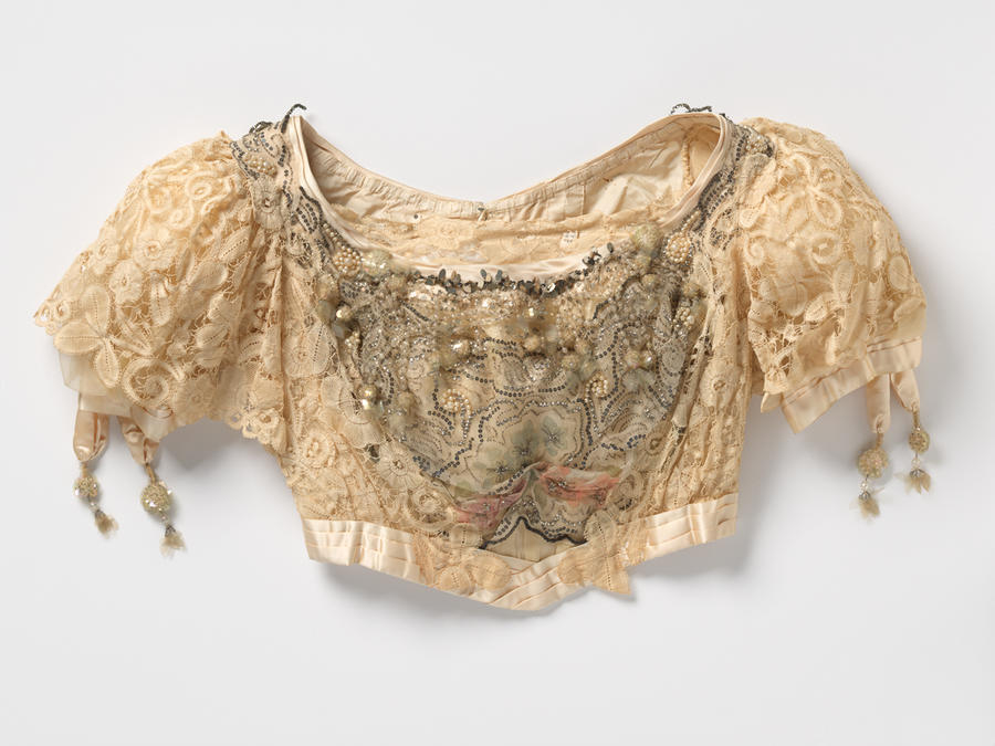 Printed silk satin weave with cut steel beads, faux pearls and gelatin sequins, silk tassels