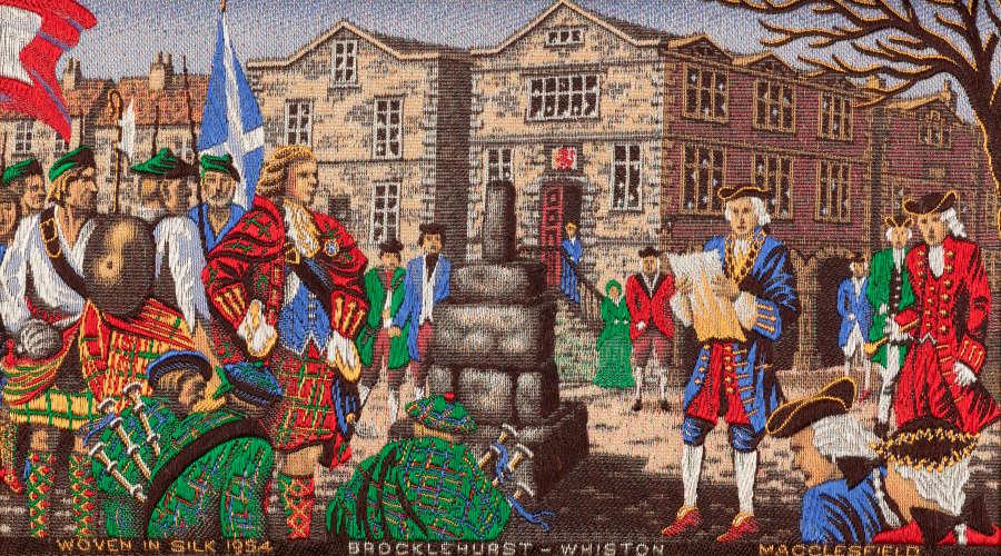 Inscription: Woven text: “Woven in silk 1954 Brocklehurst-Whiston Macclesfield.”