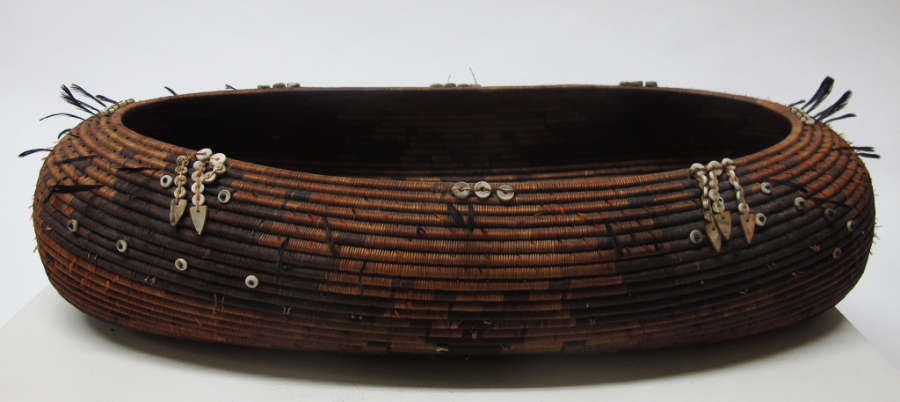 Willow, sedge root, dyed bulrush or fern root, red acorn woodpecker feathers, quail topknot feathers, abalone and clamshell disc beads; three-rod coiled