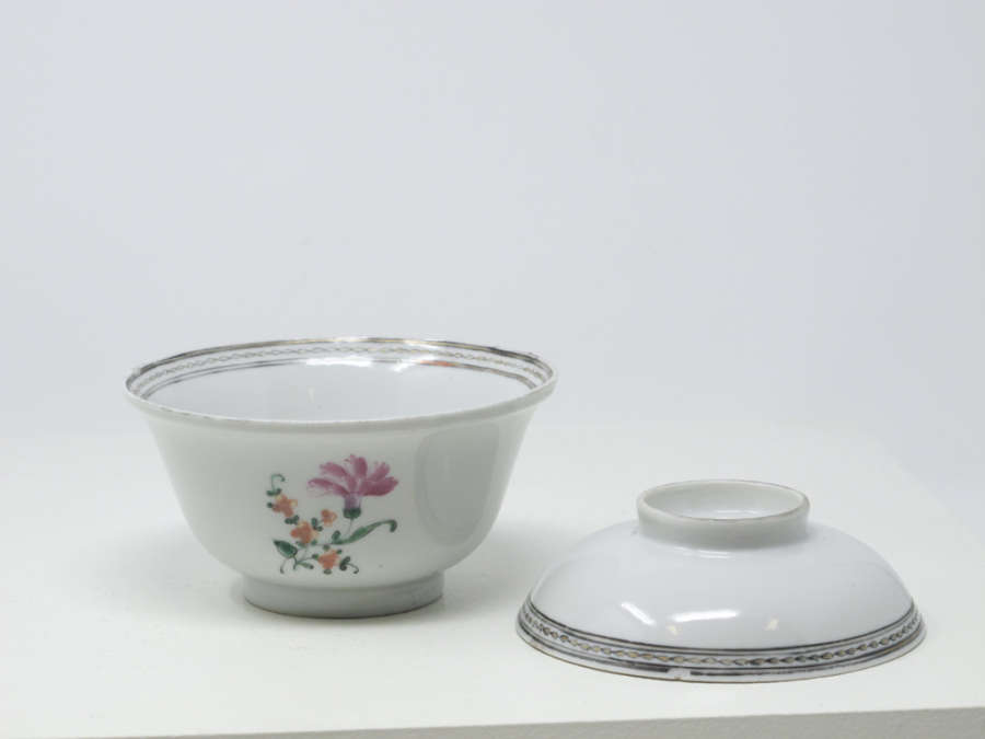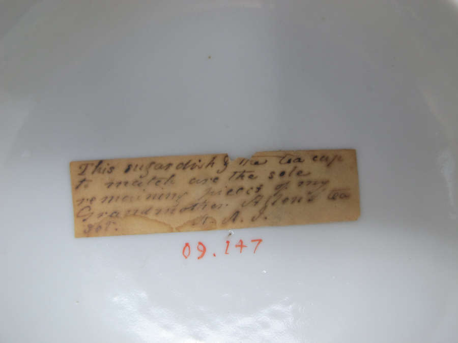 Old Label:"This sugar dish and the tea cup to match are the sole remaining pieces of my Grandmother Allen's tea set.A.A.I."