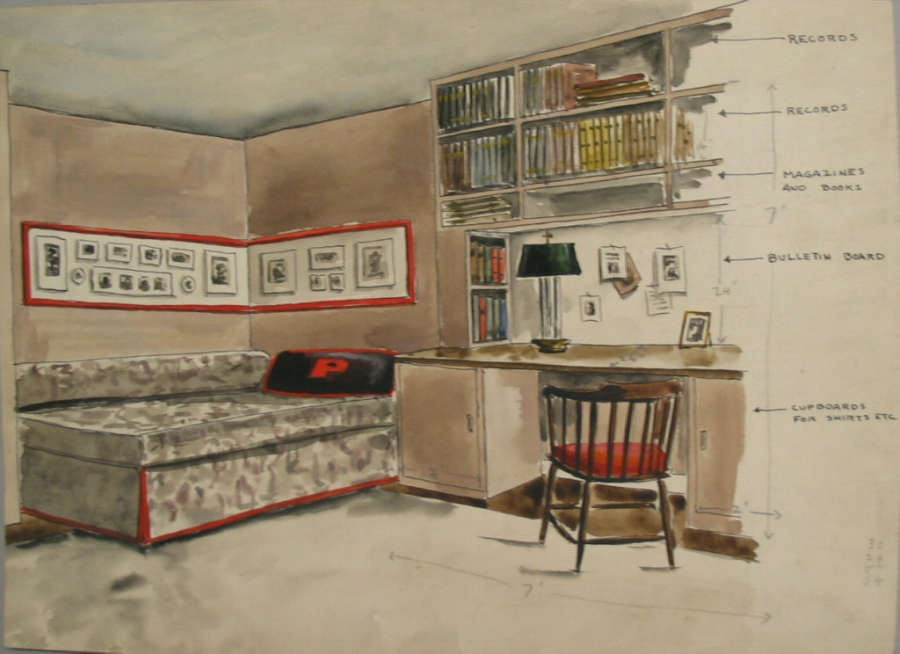 On recto in pencil, a calculation: "30 24 80 54", and notations of length: "7', 14", 24", 24", 2', 7'", and in block letter printing in ink, "RECORDS, RECORDS, MAGAZINES AND BOOKS, BULLETIN BOARD, CUPBOARDS FOR SHIRTS ETC."On verso in pencil, a series of dimensions, from the upper right corner of the drawing, clockwise: "14" / 20" / 24" / 36" / 24" / 30" / 10" / 24" / 14" / 12" ".Near the edges of the verso there are also the numbers (in pencil): "30 24 / 51" ".
