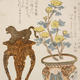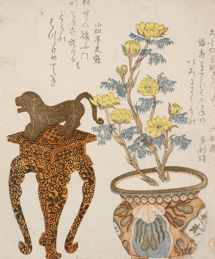 Bronze Chinese lion on stand and potted adonis plant (Seido shishi to hachiue no hana)