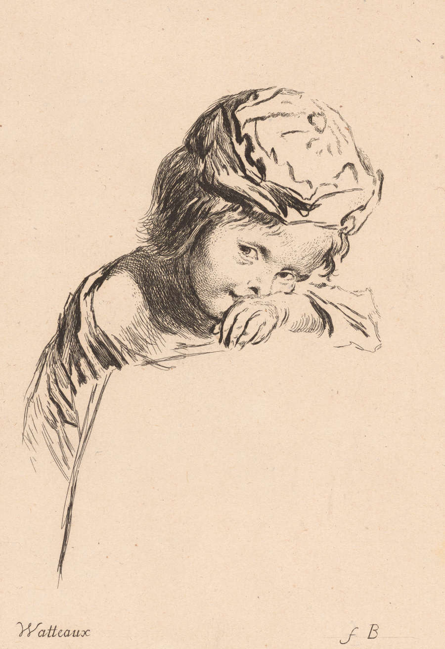 Original--Recto:inscribed in pencil in LL:G438; Buste d'enfant en bourreletIn Plate--In LL:Watteau ; in LR:f B; in LR corner:.83.