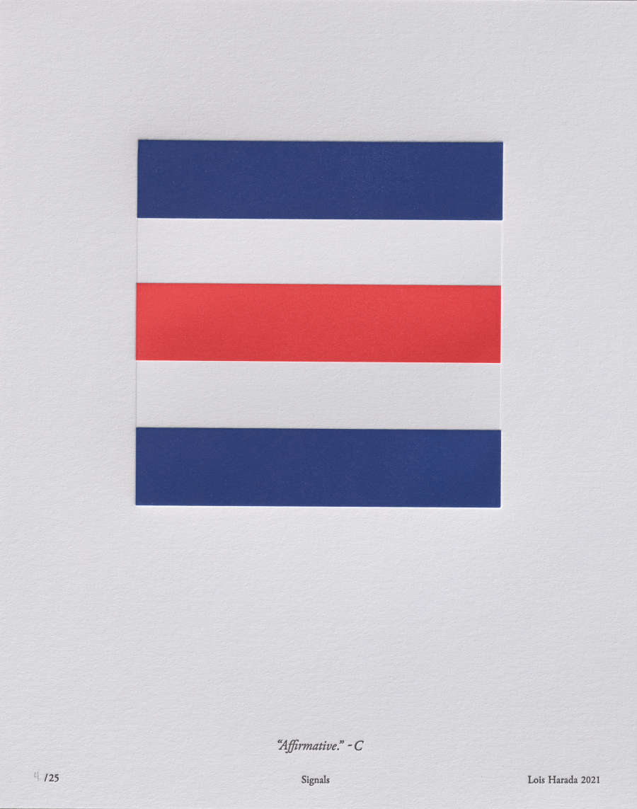 On recto, “4” inscribed in graphite LL within line printed in black ink at bottom that reads “/25 Signals Lois Harada 2021”