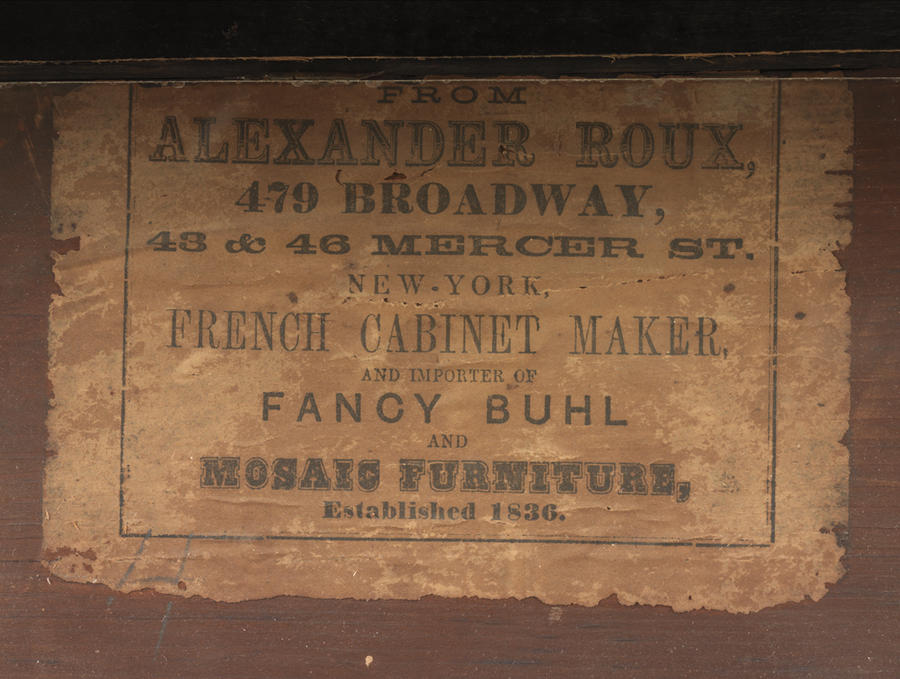 Label: Label on back, in various fonts of various sizes:FROM/ALEXANDER ROUX,/479 BROADWAY,/43 & 46 MERCER ST./NEW YORK,/ FRENCH CABINET MAKER,/AND IMPORTER OF /FANCY BUHL/AND/ MOSAIC FURNITURE,/Established 1836