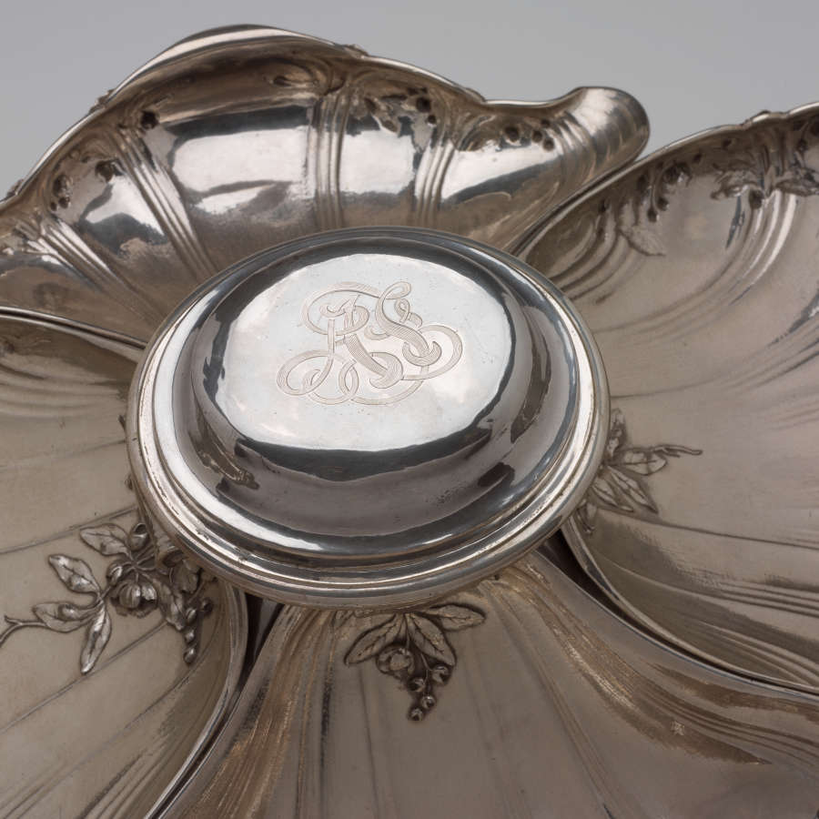 Centerpiece marked: [lion] [anchor] G / STERLING / FFM / SL [St. Louis World’s Fair mark]. Base marked: [lion] [anchor] G / STERLING / FCT / SL [St. Louis World's Fair mark].