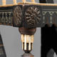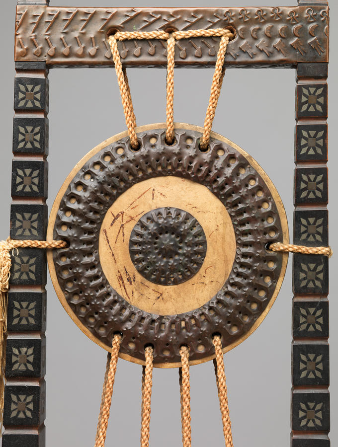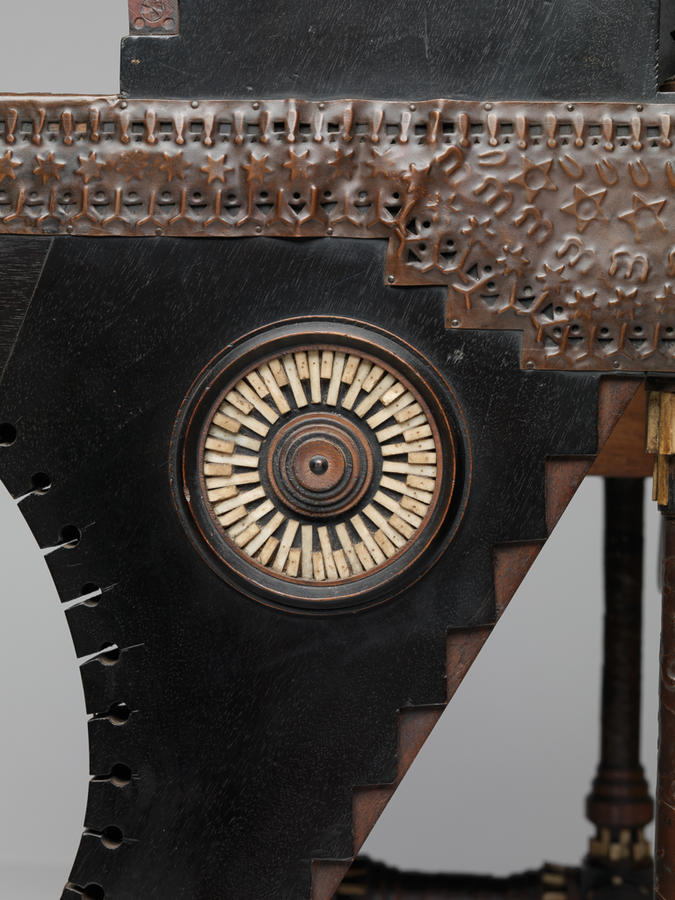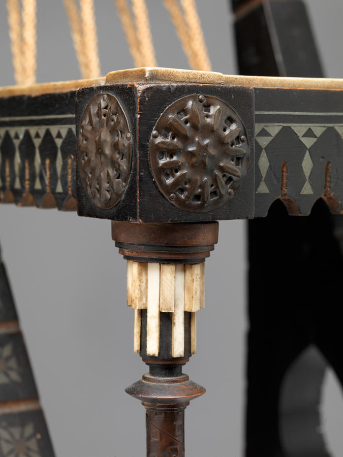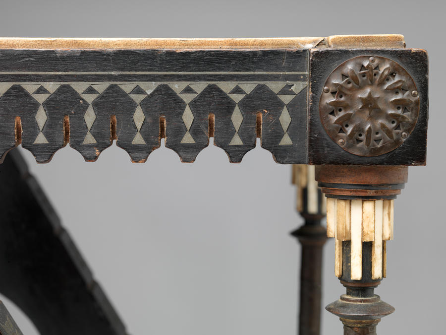 Walnut, ebonized wood, vellum, pewter, bone, brass, and silk cording and tassels