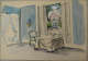Chair at table in blue and white room with shutters that reveal a painted outdoors scene