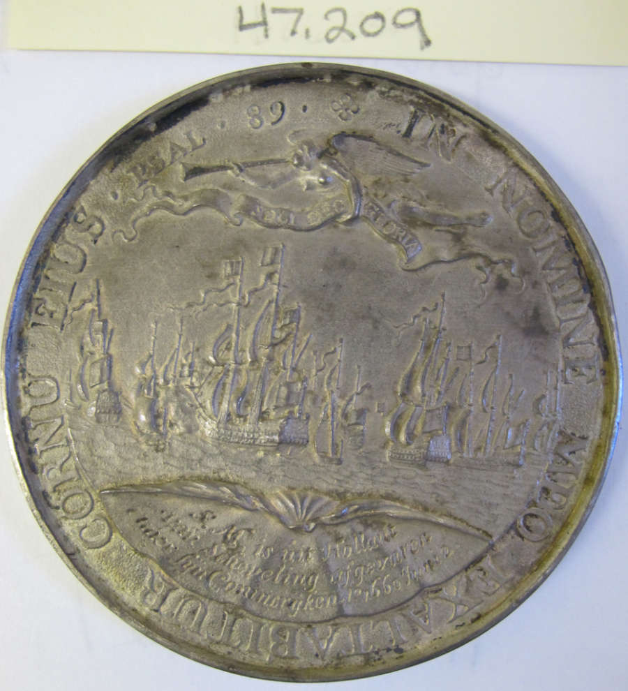 Signed on rim with monogram: PVA. F.Obv: CAROLUS II. D. G. MAGNAE. BRIT. FRA(nciae) ET HIB(erniae) RED.Rev: SOLI DEO GLORIA, and over a shell with an inscription beginning: S.M. is uit Hollant...Ao. 1660 Juni 2.Legend: IN NOMINE MEO, etc...