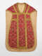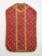 Silk damask with wrapped metallic supplementary weft (brocade), appliquéd metallic gimp trim with silver gilt thread