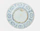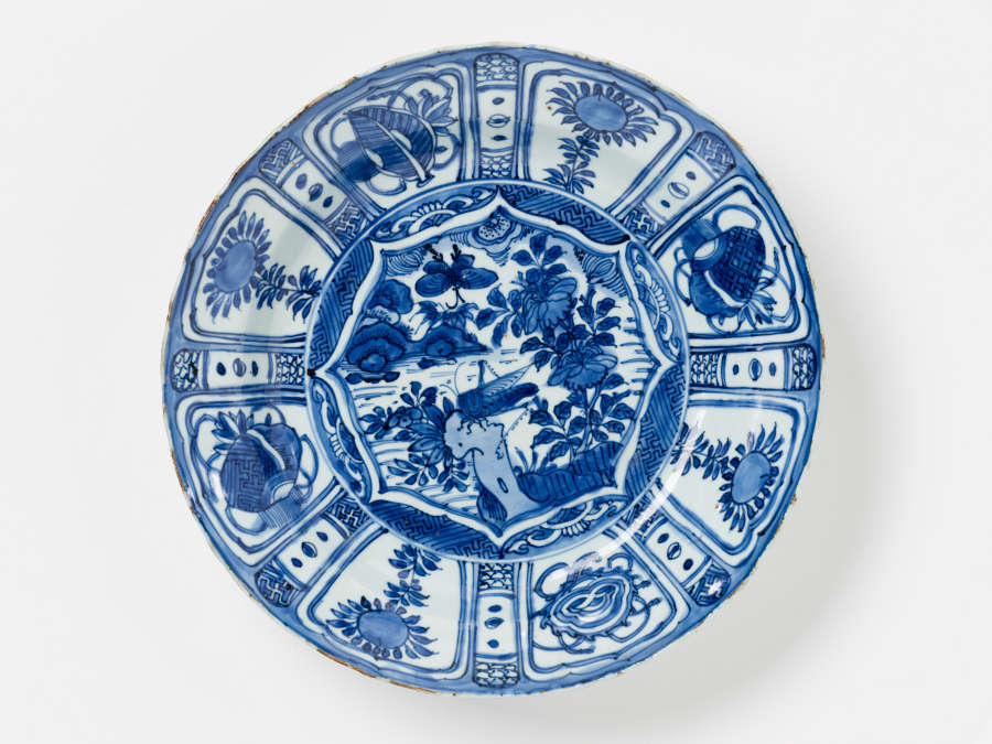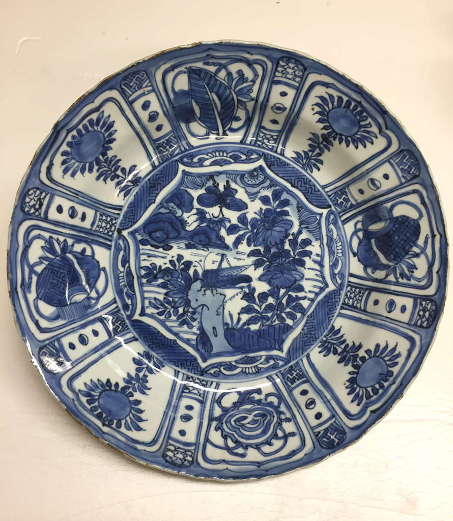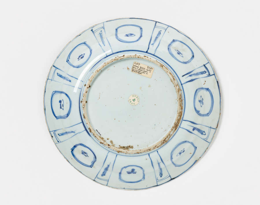 On bottom of plate: [tan rectangle sticker] "(J?)437 $1450/Wanli [1573-1619]/blue + white dish/decorated with a/grasshopper." [Round white sticker] "GUEST/&/GRAY."