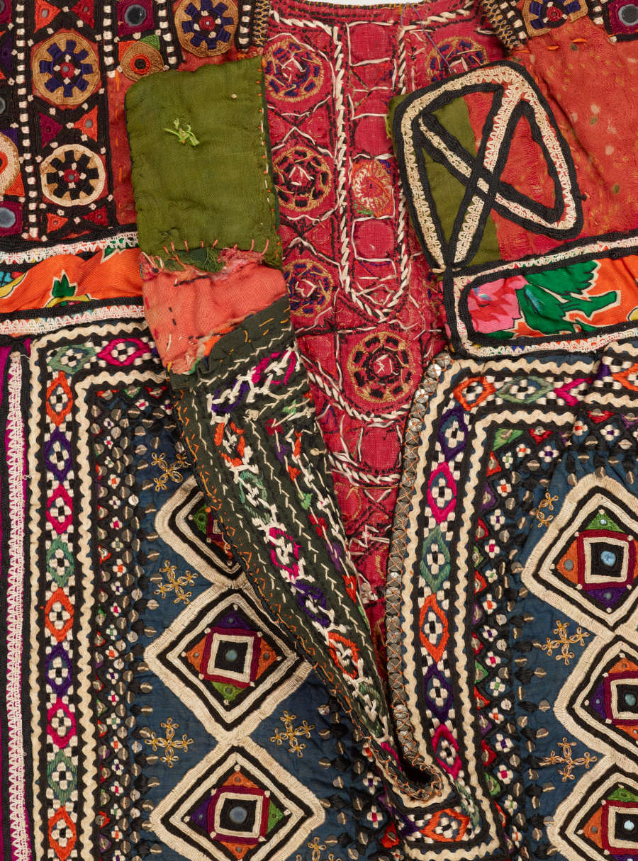 Silk and synthetic fiber satin and silk/synthetic fiber twill with silk and metallic thread embroidery in buttonhole, chain, square chain, and couching stitches; with mirrors, metallic sequins, cotton braid, and cotton lace
