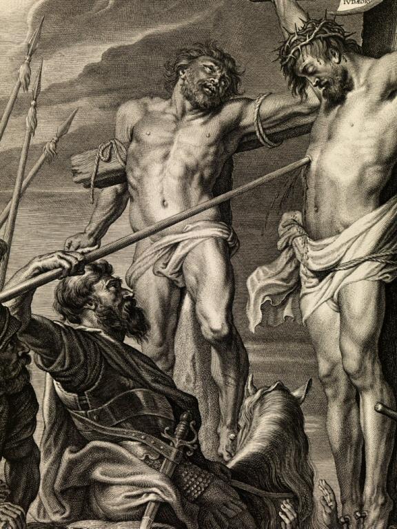 Original--Verso:in pencil, UL:3 of-; in LL:1st finished state/before the date 1631.In Plate--In LL:P.P. Rubens pinxit.; in LC:Cum Priuilegijs Regis Christianissimi, Serenissimae Infantis, et Ordinum Confederatorum.; in LR:B. à Bolswert sculp. et excudit.; titled, LC:IESVS CRVCIFIXVS.; Latin inscription below title:Venerunt milites:et quidem... (see print for full inscription)