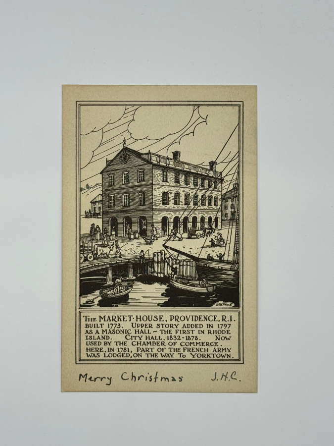 [printed below] The market house, Providence, R. I. Built 1733. Upper story added in 1797 as a masonic hall - the first in Rhode Island. City Hall, 1832-1878. Now used by the Chamber of Commerce. Here in 1781 part of the French army was lodged on the way to Yorktown.