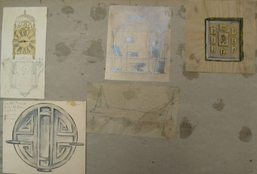 On recto of cardboard mount in pencil (clockwise from upper left): "A / B / C / D /E".On recto of matboard panel (e) in pencil script: "Pewter Frame / Oval Shelves / Applied mirror design / dia(meter) 26" ".