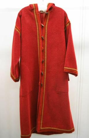 Synthetic fiber, plastic toggle buttons; pile weave, embroidered