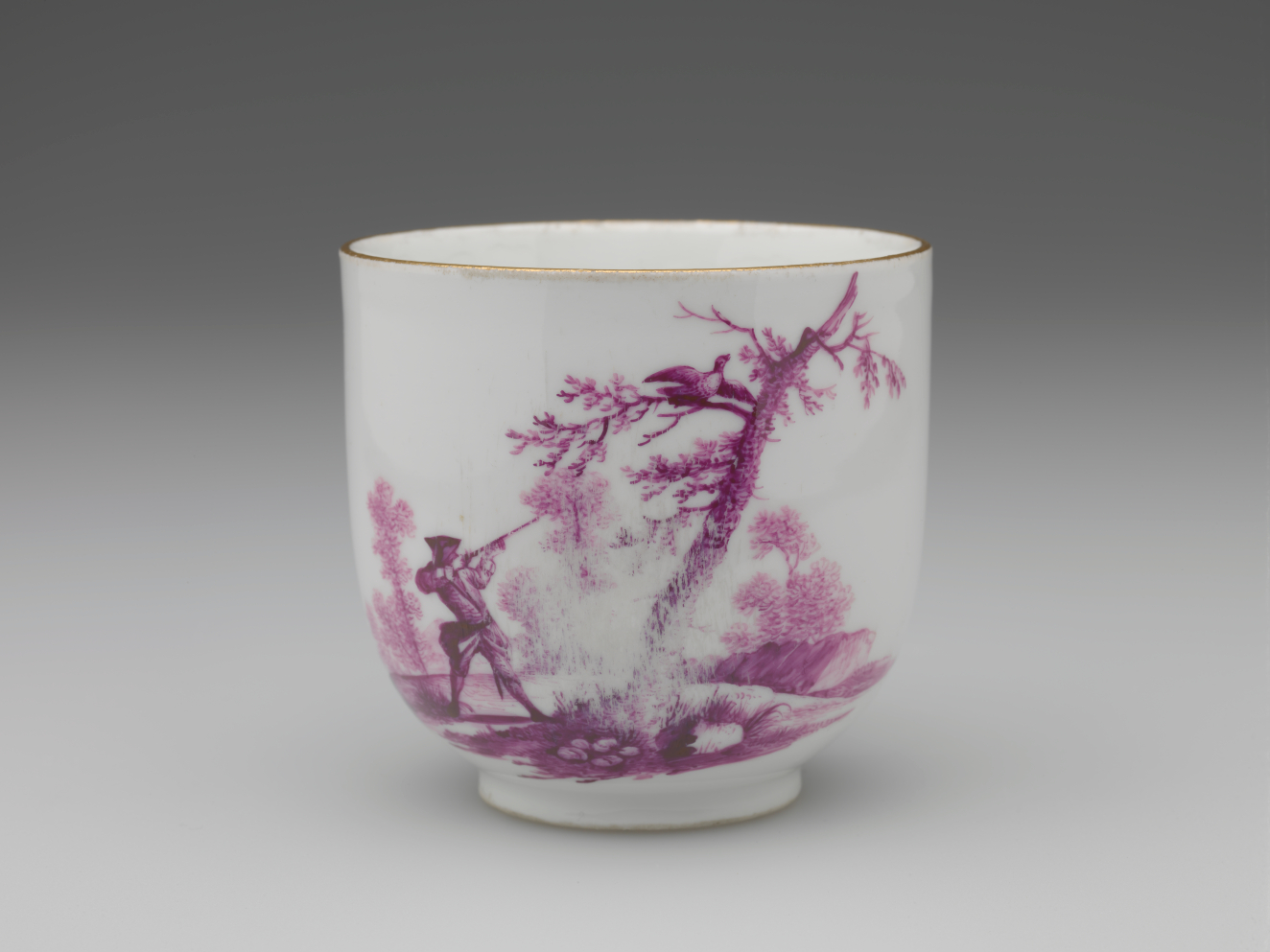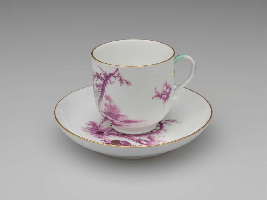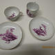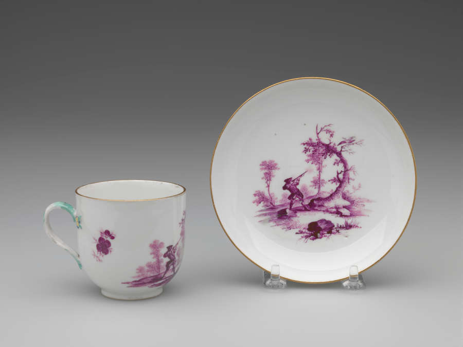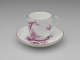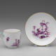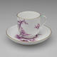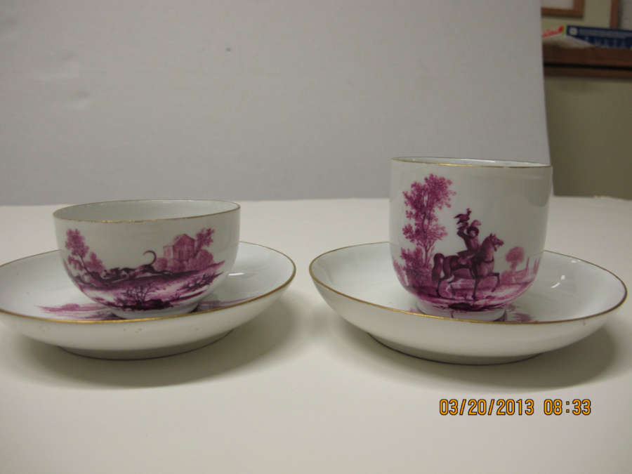 Marks: Mark of crossed swords in gray-blue on base of each. Cup impressed 17; saucer impressed 18.