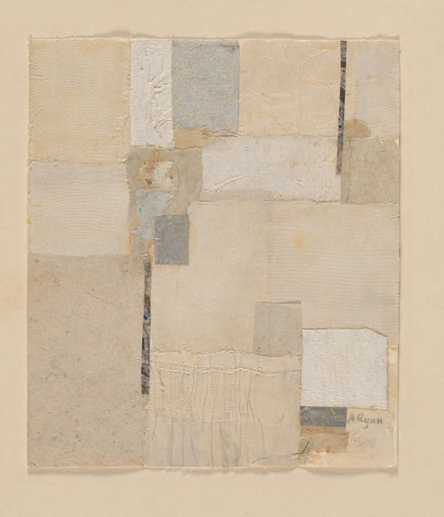 Cut and torn paper, fabric, and silver foil mounted on paper