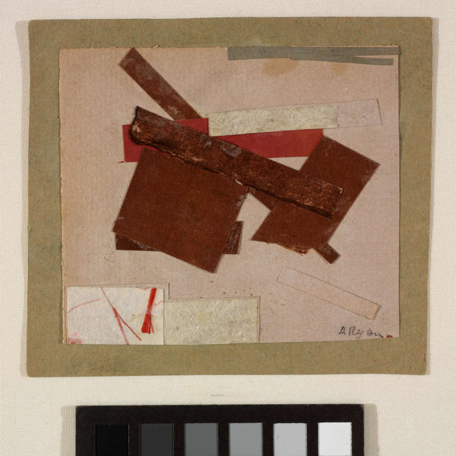 Cut and torn papers pasted on cardboard