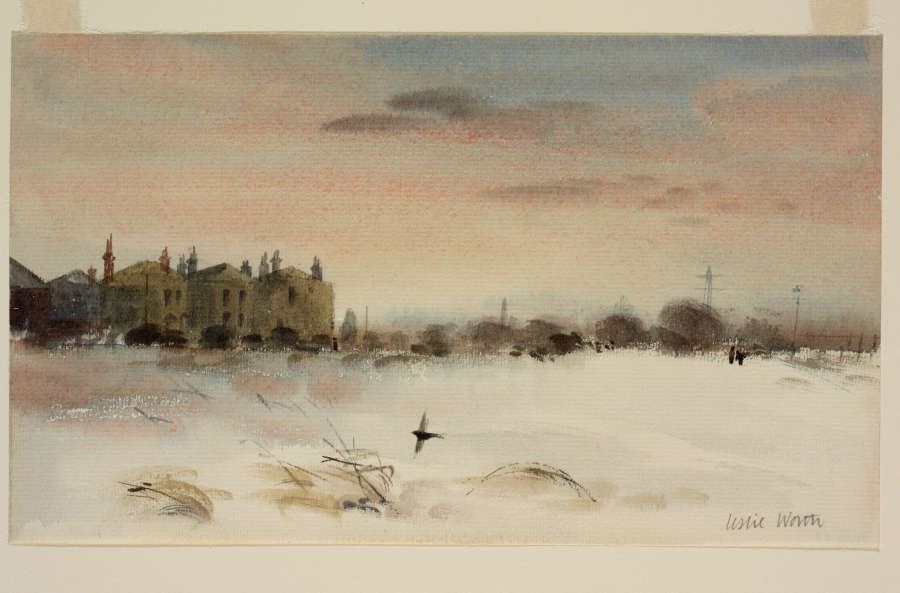 Signed in pencil, LR:Leslie Worth ; typed on label on old mount:A Common Under Snow/by/Leslie Worth. ; in pencil on old mount:Agnew