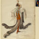 Label: sheet attached to verso, stationary printed with Locher's name and adress. written on sheet- "Warm glow of fire. Bodice of velvet with appliqued designs in silks and silk braids. Full train draperies of chiffon, shirred at sides towards ends. Stiff feathers for hair, tulle drapery." Credit / Object Number