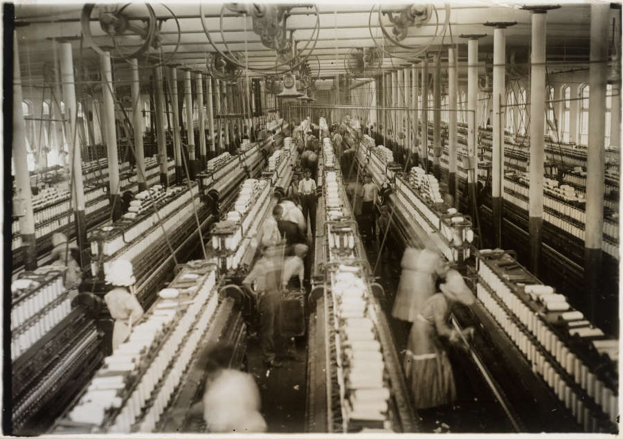 On back of mount-Witkin Gallery Label:Original Lewis W. Hine Print made for the National Child Labor Committee Subject:Interior of Cotton Mill with workers Place:Mississippi Date:1911 No:1490
