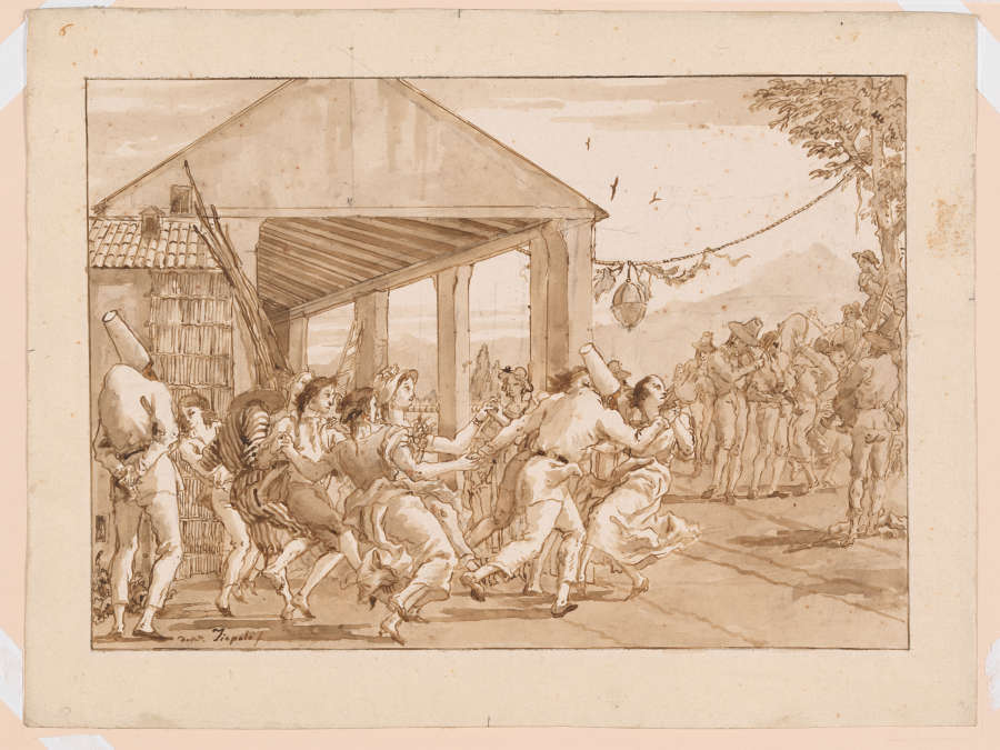 A festive crowd dances outside a barn while a group plays music in the background. Two masked figures in distinctive conical hats stand out among the revelers: they wear the costume of Pulcinella, a traditional character of Italian popular comedy theater. This drawing in pen and wash belonged to a series of more than 100 works Tiepolo made to amuse himself and members of his family. The slightly surreal juxtaposition of the lowly character with the aristocratic company is typical of Tiepolo’s humorous, enigmatic, and somewhat nostalgic depictions of everyday life in Venice and its surrounding countryside.