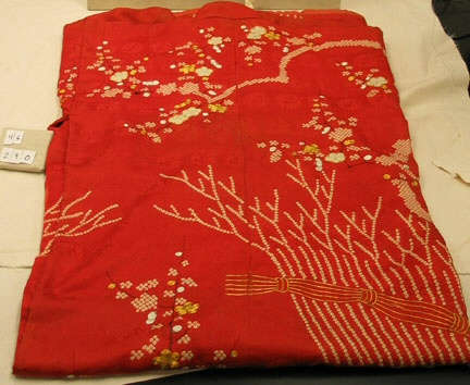 Silk; figured satin (rinzu), damask, resist dye (shibori), embroidery