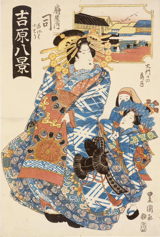 The courtesan Tsukasa and her two kamuro Agena and Kocho of the Ogiya (Ogiyanaitsukasa agena kocho: Daimonguchi no rakugan)