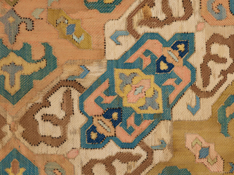 Cotton, plain weave; silk, running stitch (pattern darning), double running stitch