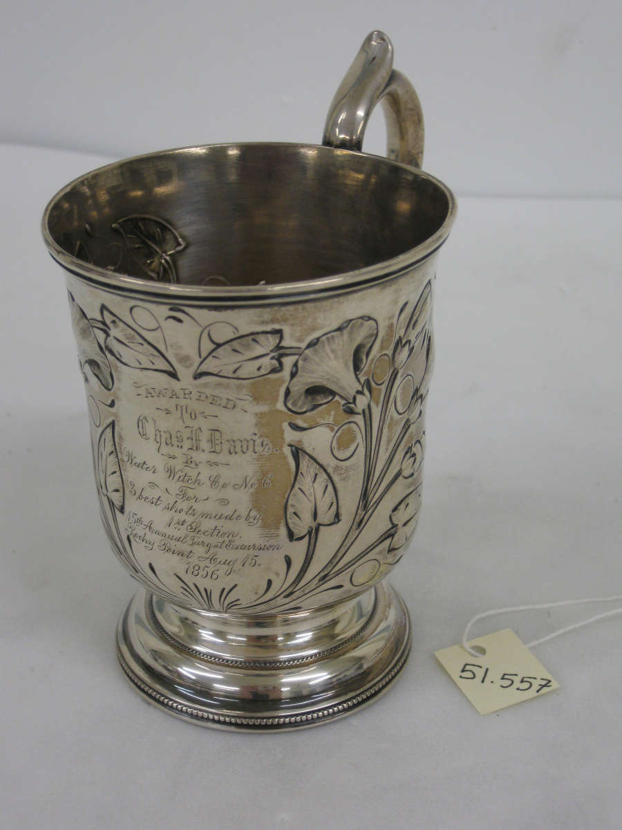 Side: Awarded to Charles F. Davis by Water Witch Co No 6 For 3 best shots made by 1st Section.15th Annual Target Excursion Rocky Point, Aug.15,1856. Bottom: Gorham's "lion, anchor, G stamps / COIN 49."